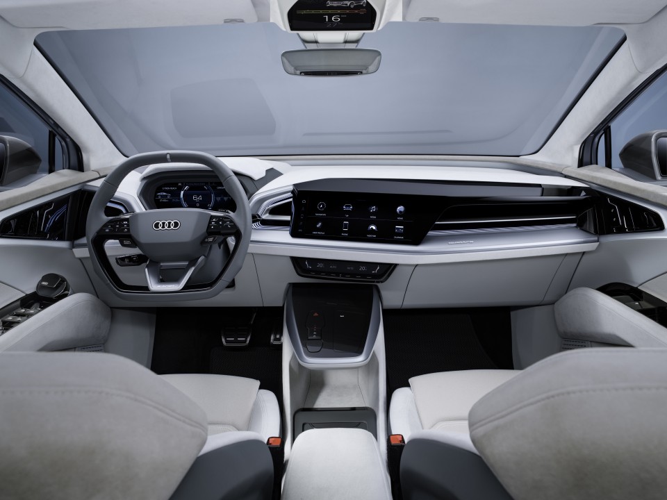 Un factor clave para el carácter deportivo y la extraordinaria dinámica es la posición baja y central en la que se instalan los componentes del sistema de propulsión. La batería de alta tensión, que tiene la forma de un bloque ancho y plano, se adapta de forma óptima a las dimensiones del Audi Q4 Sportback y está situada entre los ejes, debajo del habitáculo; pesa 510 kg. El centro de gravedad del Audi Q4 Sportback e-tron concept se encuentra, por tanto, a un nivel similar al de una berlina con propulsión convencional.