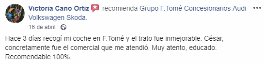 “Hace 3 días recogí mi coche en F.Tomé y el trato fue inmejorable. César, concretamente fue el comercial que me atendió. Muy atento, educado. Recomendable 100%.”